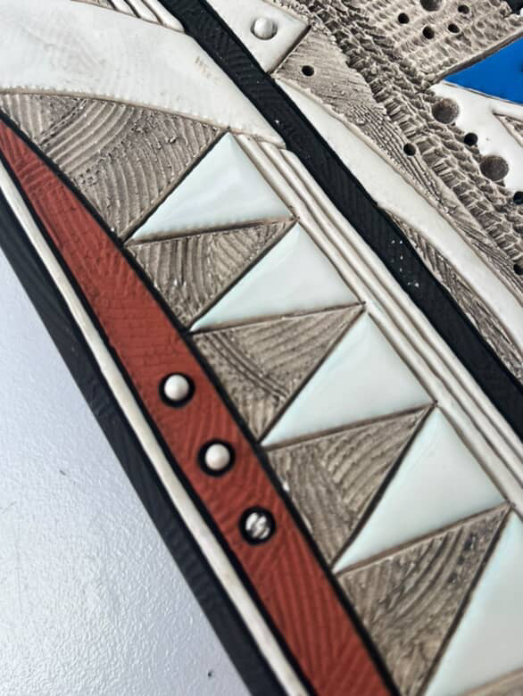 A stricking signed ceramic platter by Rodney Alan Blumenfeld, showcasing his bold use of geometric abstraction and hand-painted detail. This square earthenware platter features a dynamic composition of angular forms in black, white, cobalt blue, and earthy terracotta accents, balanced with intricate linework and textured surfaces.