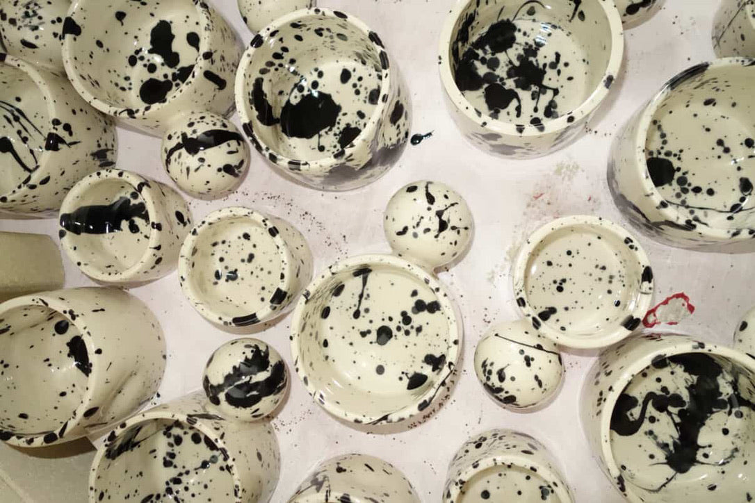 Hand thrown from a textured stoneware finished in bright gloss glaze covered in wild, expressive bursts of splatters - two sizes available.