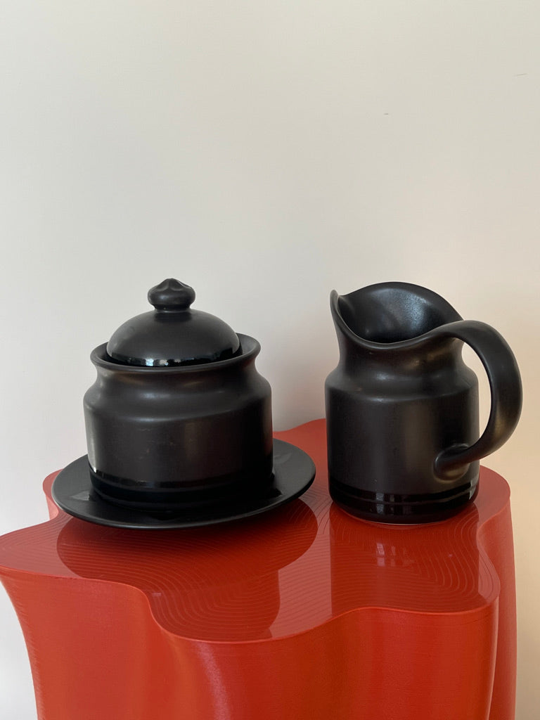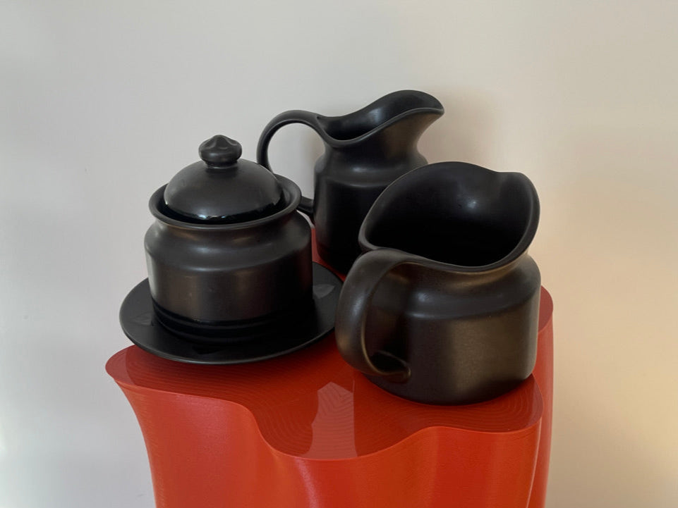 Beautiful 3 piece Pfaltzgraff ceramic set, marked on the underside. Finished in a rish matte black glaze, this timeless design combines modern simplicity with vintage charm.