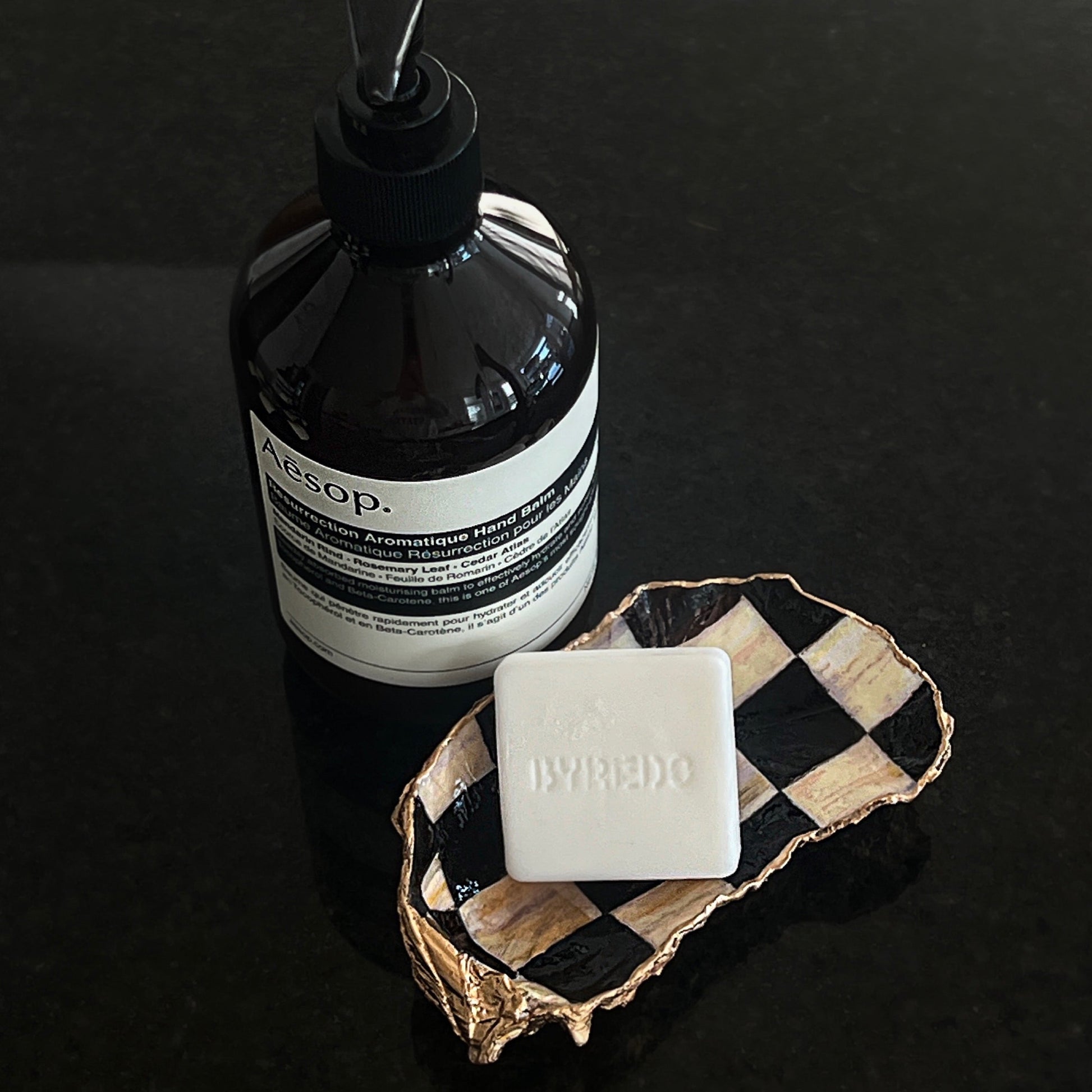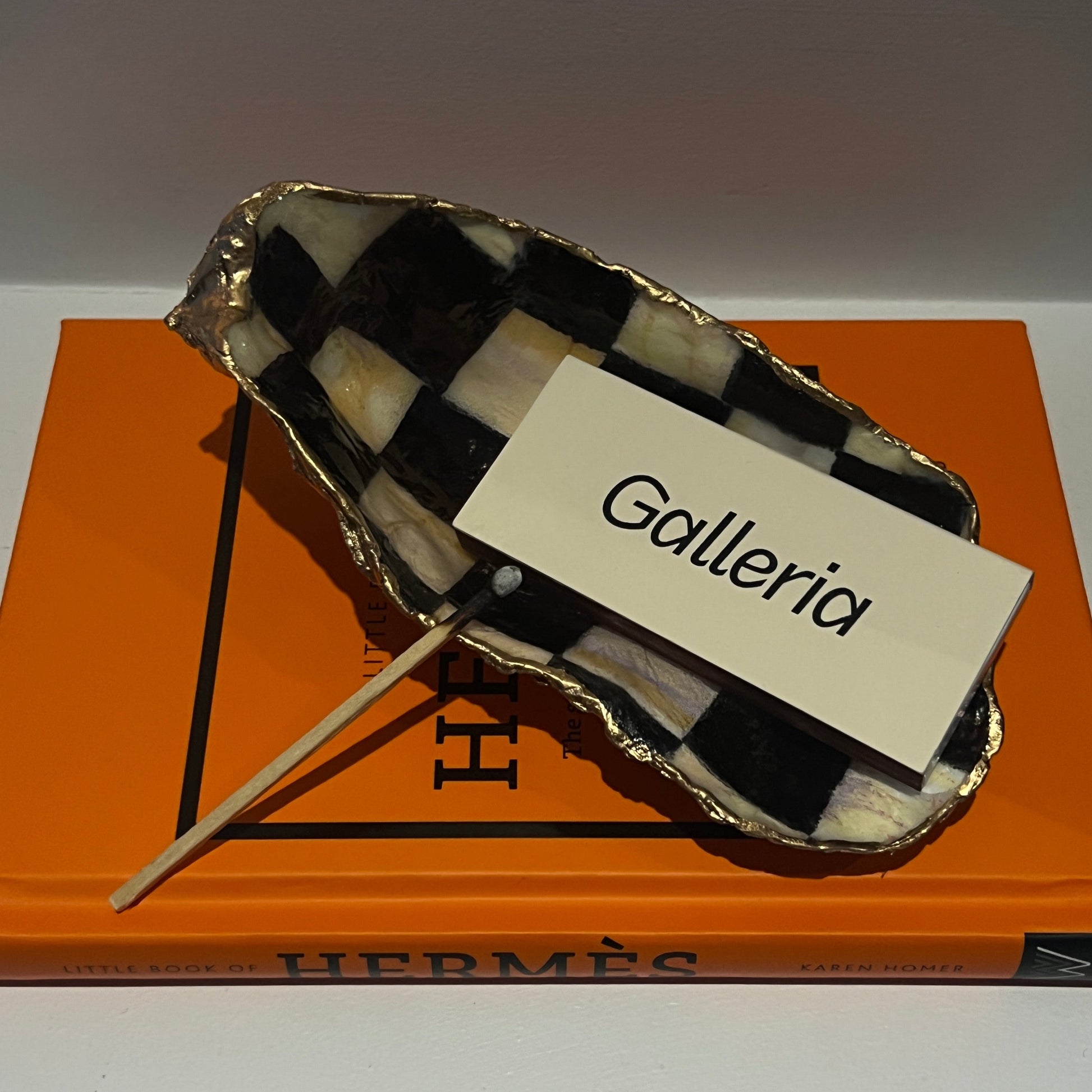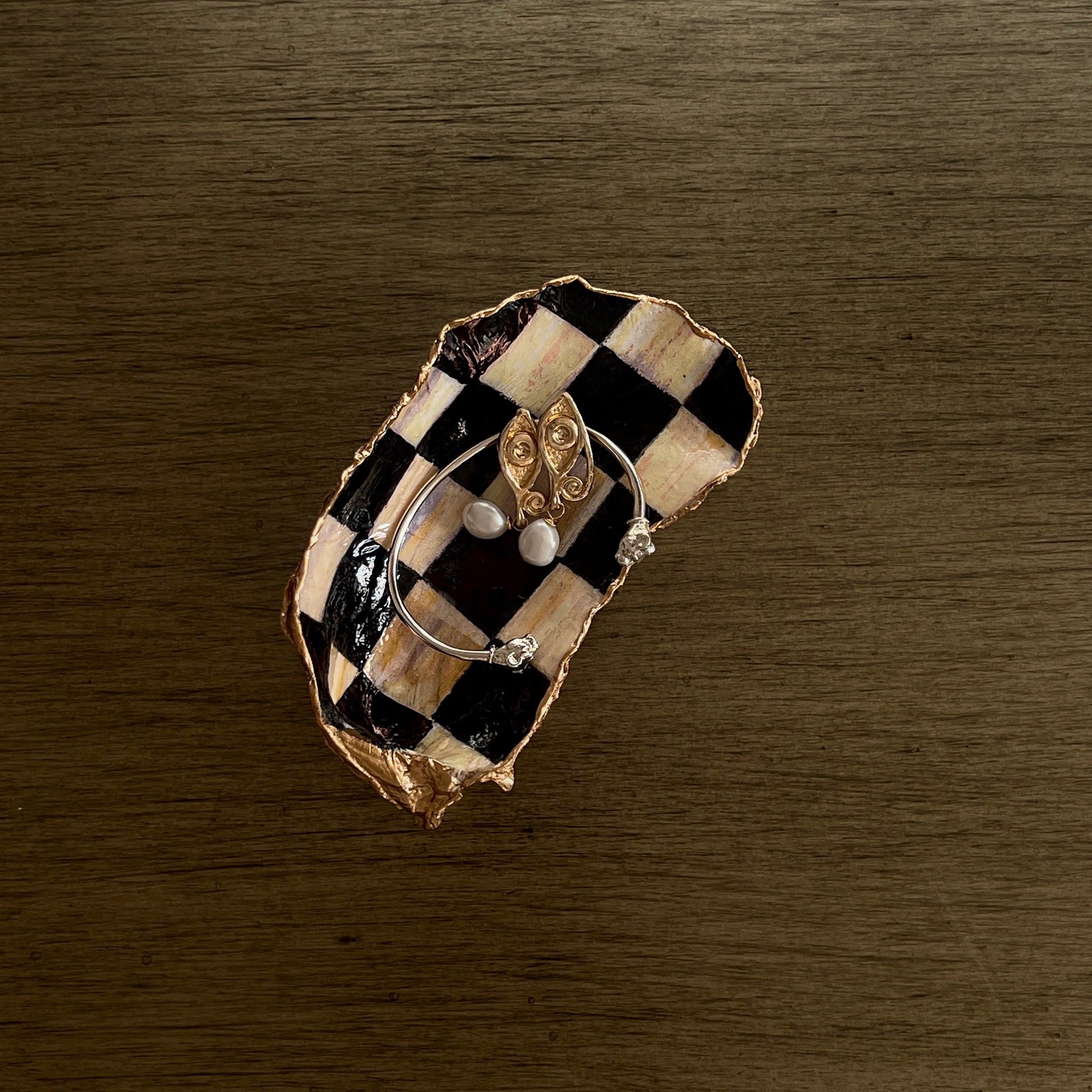 Checkered painted oyster shell trimmed in gold leaf. This unique and stunning piece can be used as a jewelry dish, "main de sel" in your kitchen, a soap dish, for your keys on your entry table or simply as a home decor on your favourite coffee table book. Sizes and shapes of shell will vary.