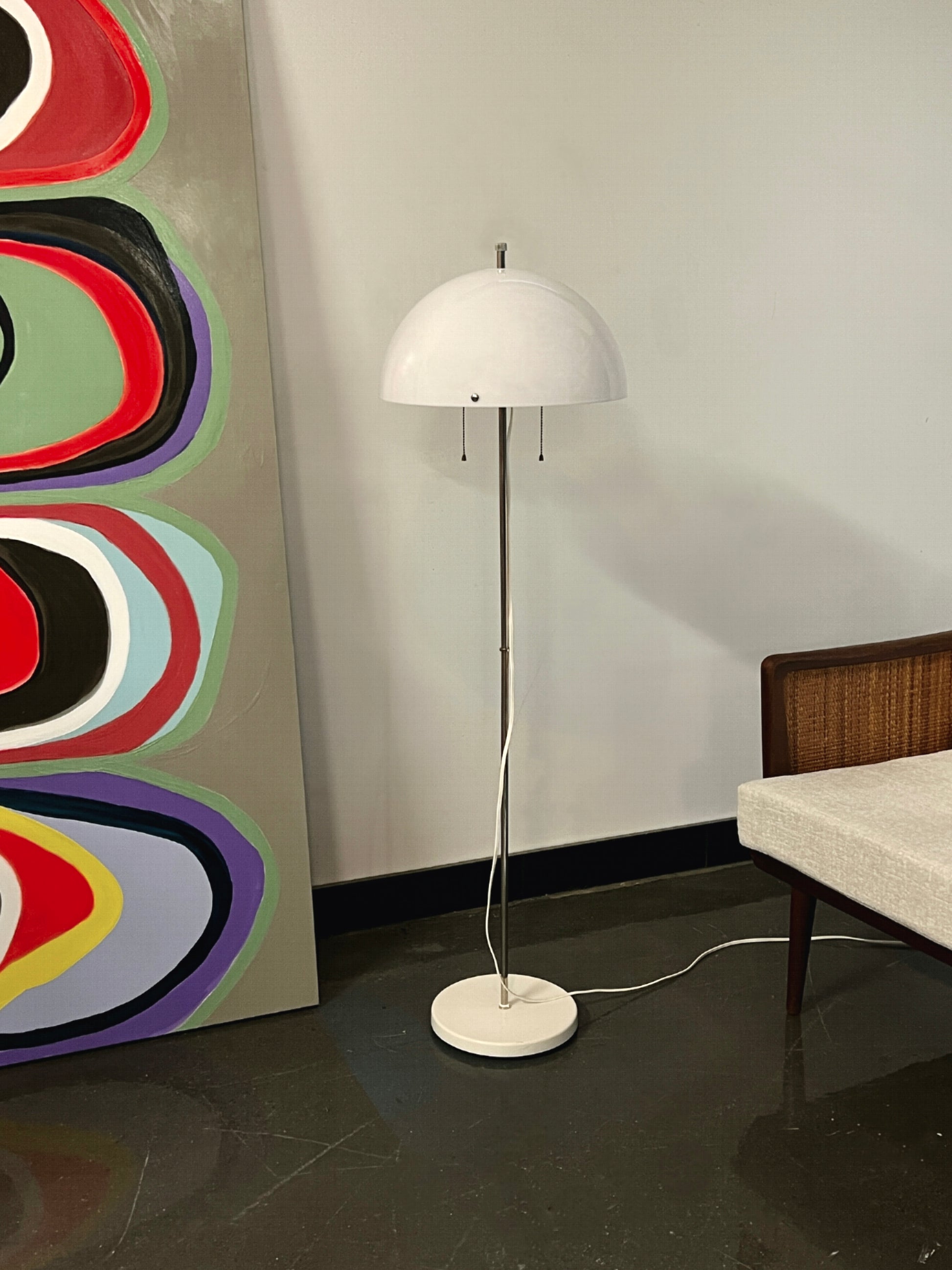Mushroom chrome and white floor lamp made by Fagerhults in Belysning Sweden in the 1970's. The acrylic shade is ajustable so you can set the height to your liking.