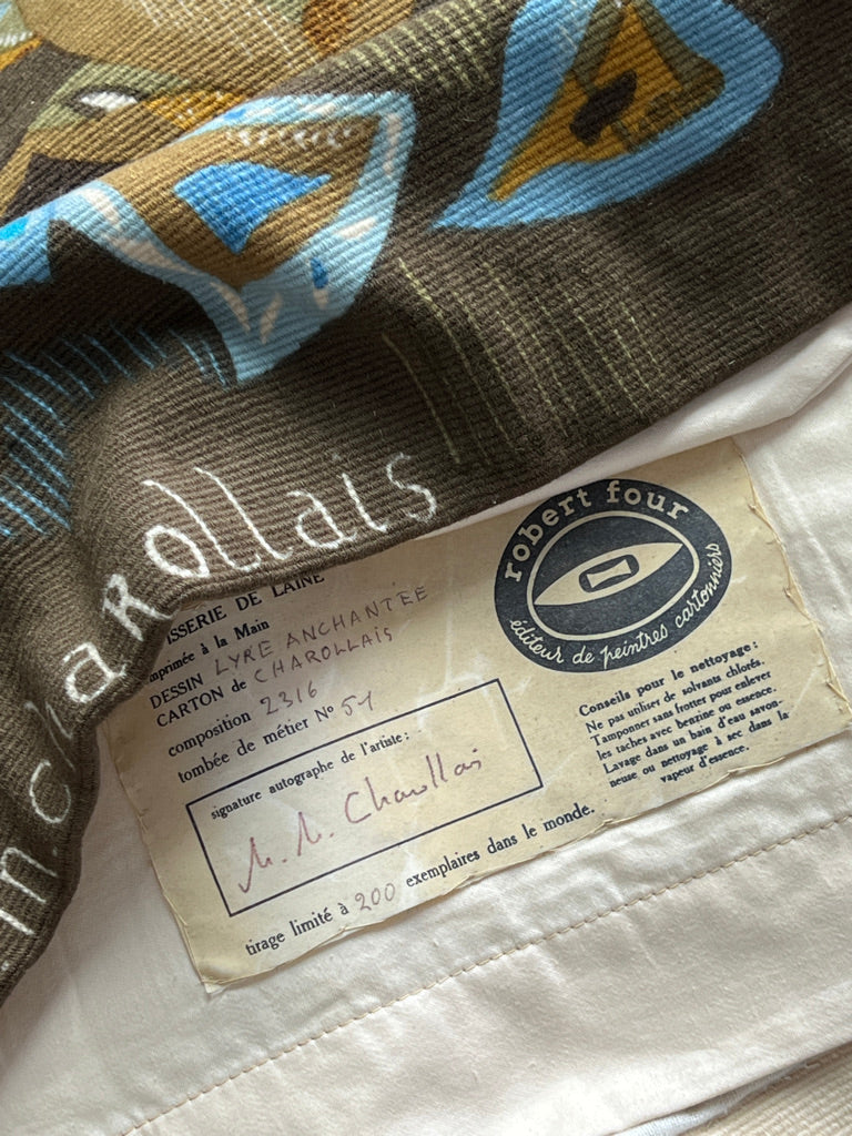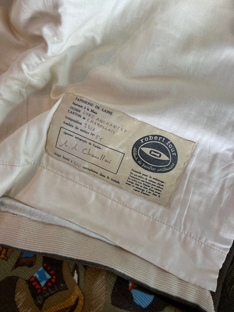 Wool tapestry signed MM Charollais. Tapestry printed in silkscreen "The enchanted lyre" Manufacture Robert Four Paris Aubusson from the 60s.
