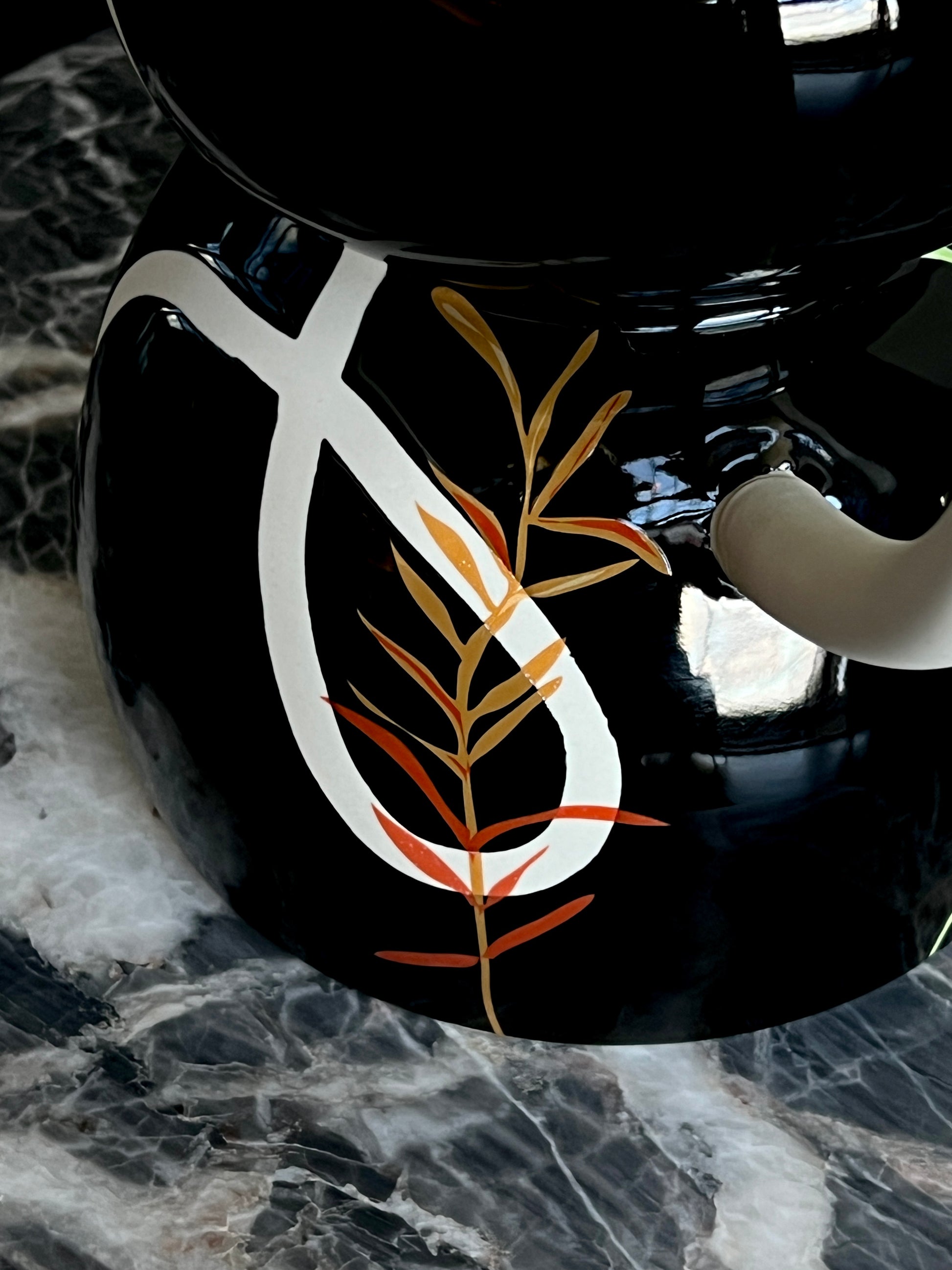 Vase by Rachel Joanis in partially glazed stoneware, some parts left unglazed such as the two handles, decorated with abstract lines on a black background.