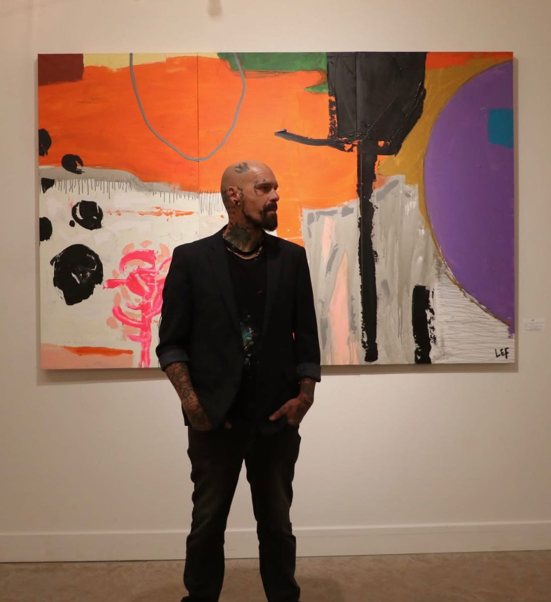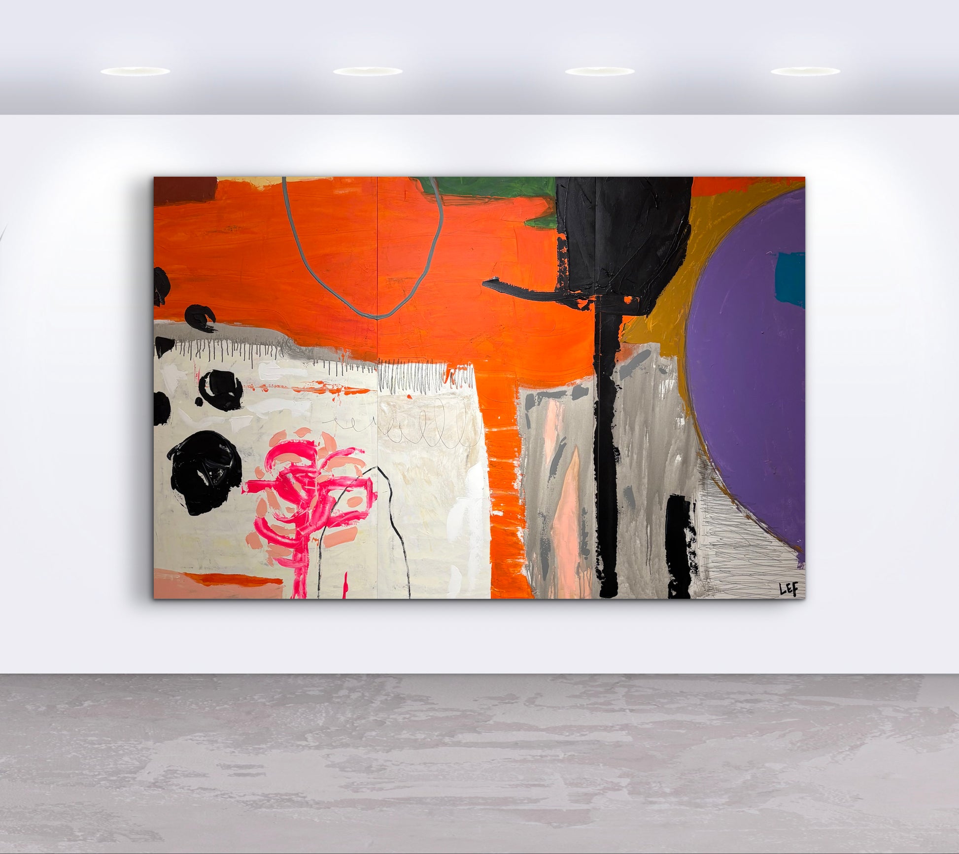 Statement scale mixed media on canvas, a bold contemporary abstract defined by vibrant orange fields, expressive gestural marks, layered textures, and striking geometric contrasts. The monumental format creates an immediate architectural presence, making it an ideal focal point for large interiors, corporate spaces, or modern residences. A powerful collector piece that brings energy, depth, and gallery level impact to any room.